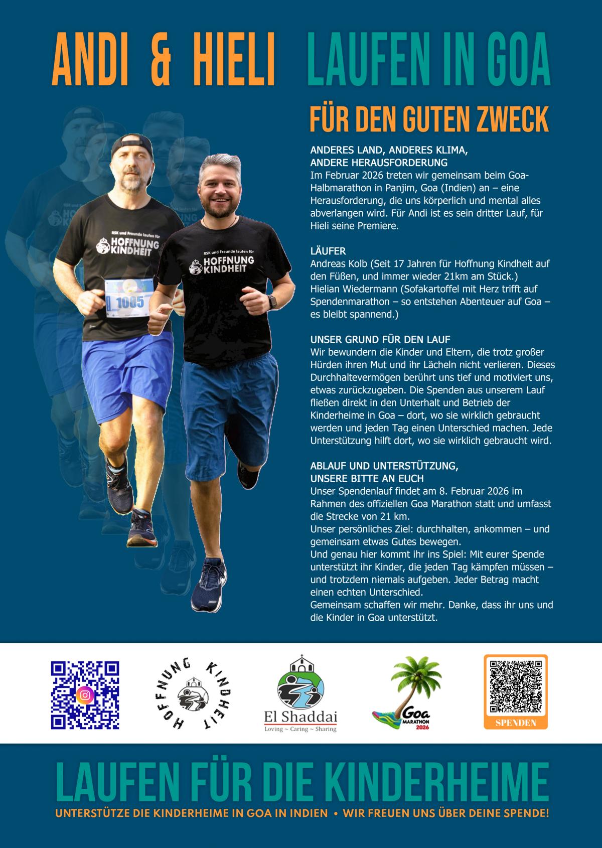 Andreas Kolb und Hielian Wiedermann nehmen am Halbmarathon in Goa teil und gestalten den Lauf als Spendenlauf. Bitte gerne teilen, verbreiten, bewerben, …